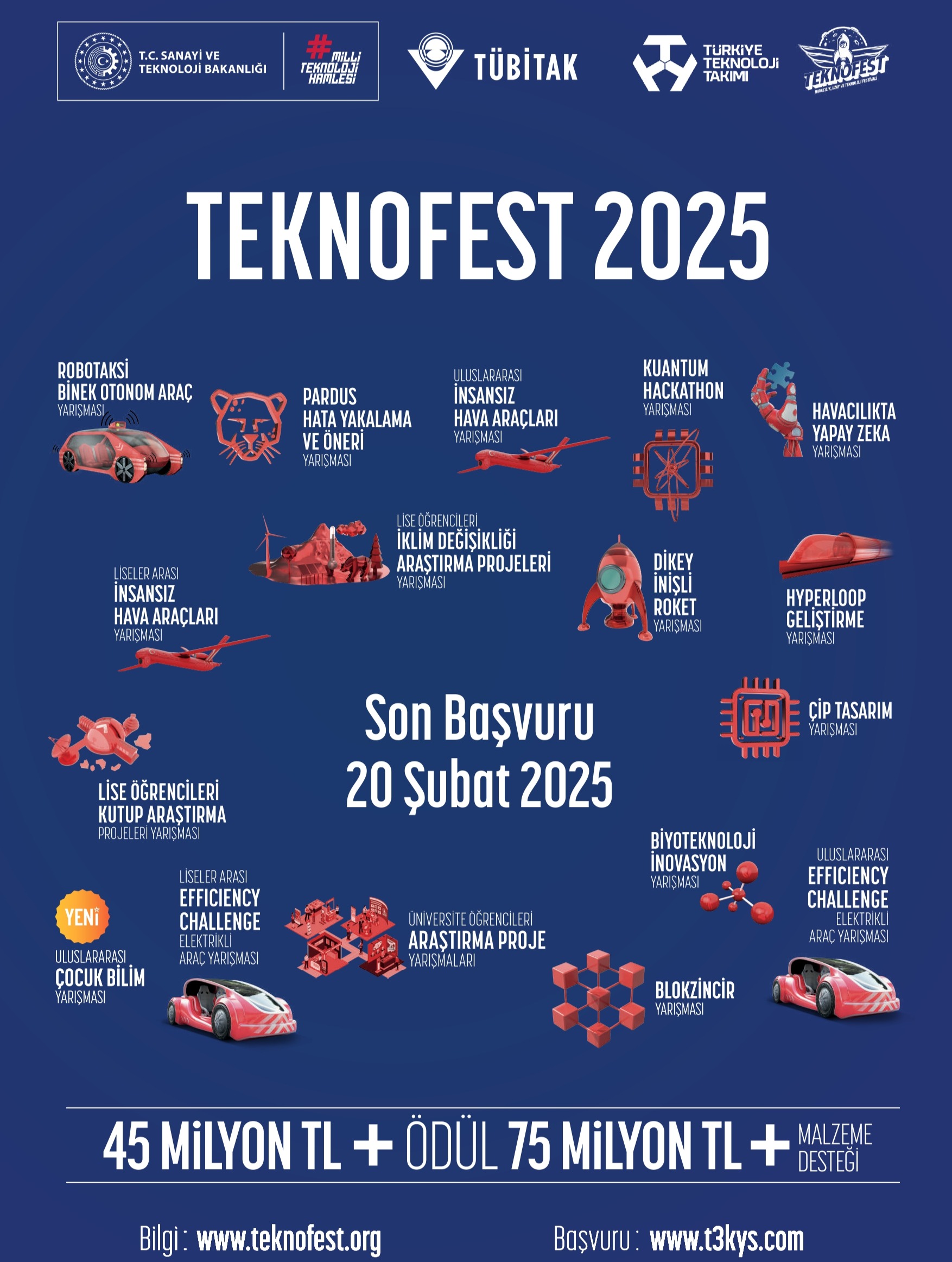 Detaylı bilgi www.teknofest.org sayfasından duyurulmakta, başvurular 20 Şubat 2025 tarihine kadar www.t3kys.com sisteminden alınmaktadır.