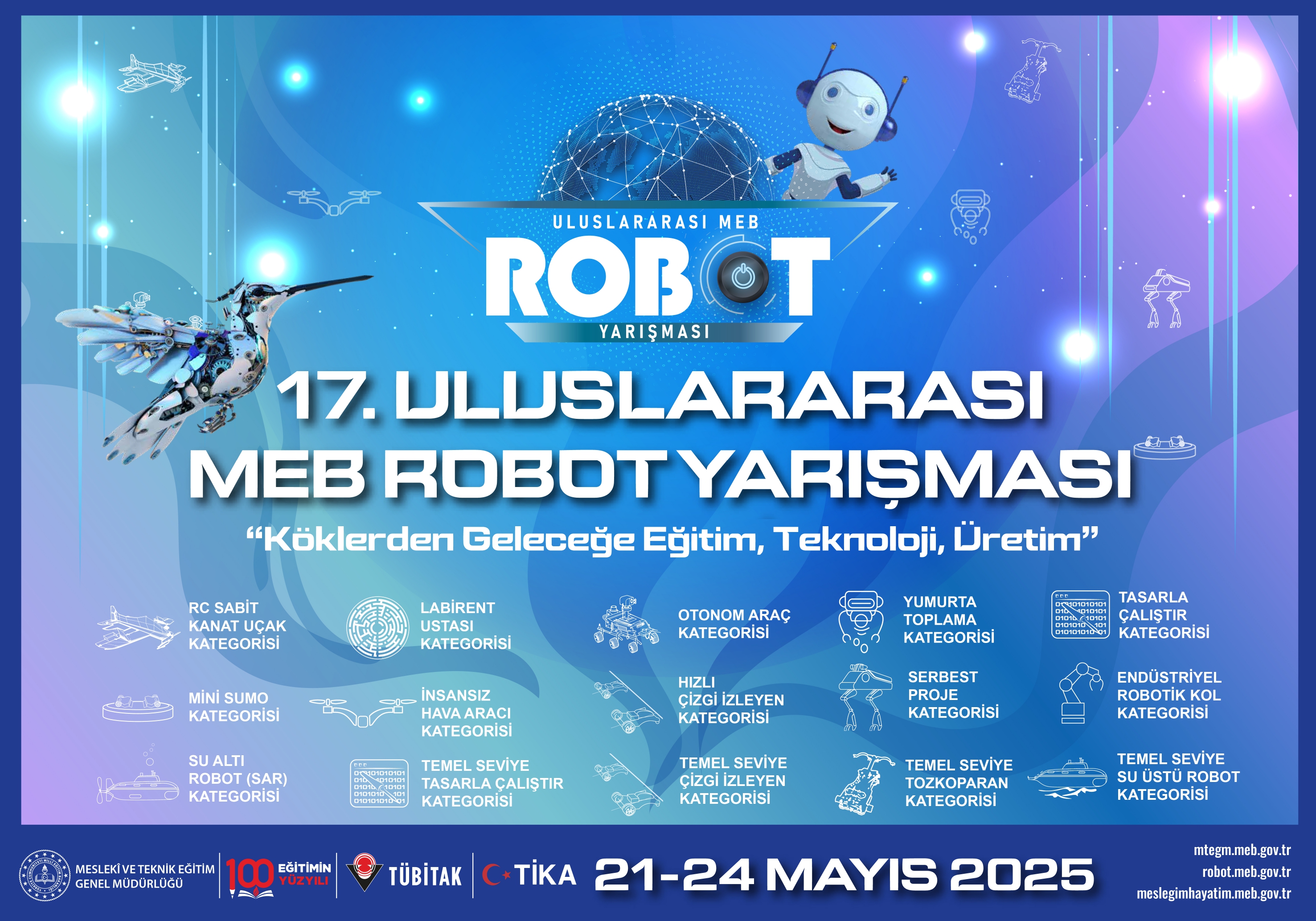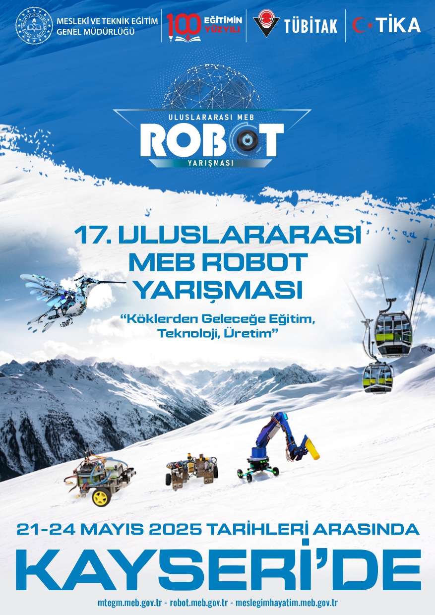Ülkemizde meslekî ve teknik eğitimin niteliğinin artırılması, toplumda bu alanda farkındalık oluşturulması, girişimci ve rekabetçi bireyler yetiştirilmesi, endüstriyel ve teknolojik gelişmelerin tanıtılması, sergilenmesi ve deneyimlerin paylaşılması amacıyla, Millî Eğitim Bakanlığı Eğitim Kurumları Sosyal Etkinlikler Yönetmeliği kapsamında ortaokul ve dengi okullar ile ortaöğretim ve üniversite öğrencilerine yönelik Uluslararası MEB Robot Yarışması düzenlenmektedir. 17. Uluslararası MEB Robot Yarışmasının, 21-24 Mayıs 2025 tarihleri arasında Kayseri'de, Millî Eğitim Bakanlığı Genel Müdürlüğü koordinesinde, Kayseri Valiliği İl Millî Eğitim Müdürlüğü yürütücülüğünde "Köklerden Geleceğe Eğitim, Teknoloji, Üretim" teması ve "Teknoloji'nin Kodları Bu Yıl Kayseri'de Yazılıyor." sloganı ile 15 (on beş) kategoride gerçekleştirilmesi planlanmaktadır. Söz konusu yarışmanın Uygulama Kılavuzu, Kategori Kılavuzları ve afişleri ilgili https://bulut.meb.gov.tr/1fu5zfkk mebbulut bağlantısında yer almakta olup Milli Eğitim Genel Müdürlüğü https://robot.meb.gov.tr/ internet adresinde de yayınlanmıştır. Yarışma başvuruları bu adresten ve mobil uygulama üzerinden gerçekleştirilecektir.