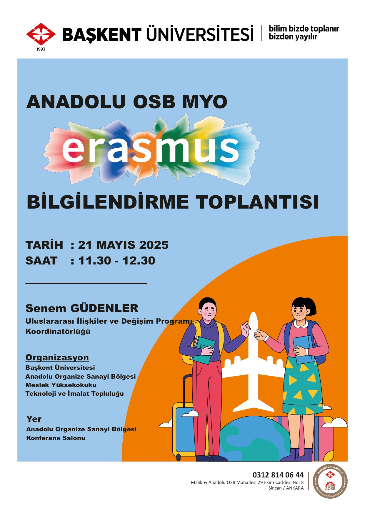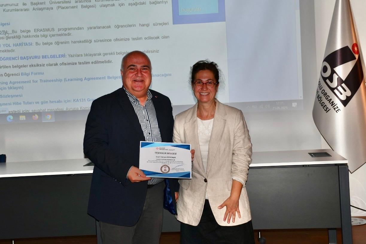 Başkent Üniversitesi Anadolu OSB MYO bünyesinde Teknoloji ve İmalat Topluluğu organizasyonunda yapılan Erasmus Bilgilendirme Toplantısı Uluslararası İlişkiler ve Değişim Programı Koordinatörlüğünden Sn. Senem GÜDENLER'in katılımları ile 21 Mayıs 2025 tarihinde 11:30'da Anadolu Organize Sanayi Bölgesi Müdürlüğü Konferans Salonunda gerçekleştirilmiştir. Değerleri sunumları için Sn. Senem GÜDENLER’e teşekkür ederiz.
