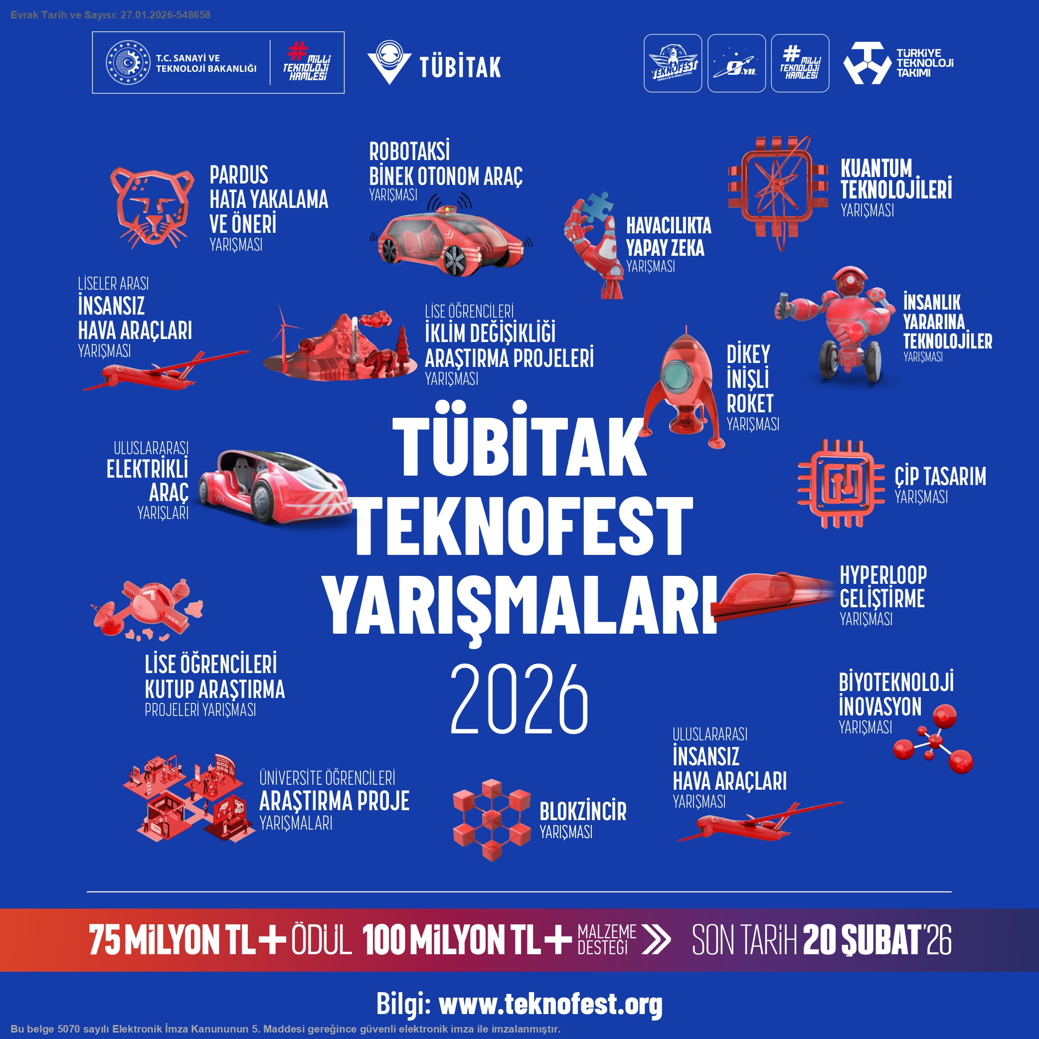 T.C. Sanayi ve Teknoloji Bakanlığı ile Türkiye Teknoloji Takımı Vakfı (T3 Vakfı) yürütücülüğünde düzenlenen TEKNOFEST Havacılık, Uzay ve Teknoloji Festivali kapsamında TÜBİTAK tarafından ilkokul, ortaokul, lise, üniversite öğrencileri ile mezunlara yönelik olarak roket, yapay zekâ, biyoteknoloji, insansız hava araçları, elektrikli araçlar, yeni nesil ulaşım, mikroelektronik teknolojileri, iklim değişikliği ve benzeri alanlarda Ek'te yer alan afişte belirtilen toplam 16 yarışma düzenlenmektedir.